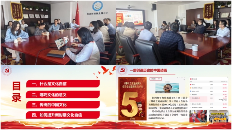 为深入贯彻习近平文化思想,引导支部党员深刻理解文化自信的内涵与意义,增强对中华优秀传统文化的认同感和自豪感,3月21日,土壤中心第二党支部史怡同志以《哪吒闹海背后的中国文化自信》为题,通过剖析电影《哪吒之魔童闹海》,探讨其中蕴含的深厚文化意蕴。