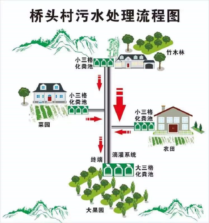 根据桥头村住宅分布、地形地势,入户污水收集系统借助排水沟的布局,覆盖到户,每户厕所污水和生活杂排水等所有生活污水进入户用小三格式化粪池(容积为1.5立方米)完成第一次厌氧发酵;1-2户的户用化粪池上清液经重力流进入农户房前屋后地势较低的菜园、稻田、果园或竹木林处的小三格式化粪池(容积为1.5-3.0立方米)完成第二次厌氧发酵,附近农户可通过取水口取水直接浇地;在靠近大片农作物田地,方便村民挑取的地点设置大三格式化粪池(容积为9.0立方米),作为处理终端完成第三次厌氧发酵,可作为肥水还田利用,满足20亩左右果园的资源化利用。该技术建设成本低于5000元/户,适应于具有地势落差的丘陵地带。若能在设计管道时考虑落差或者有小型吸污车,平原地区农村也可借鉴这种污水资源化利用的技术模式。