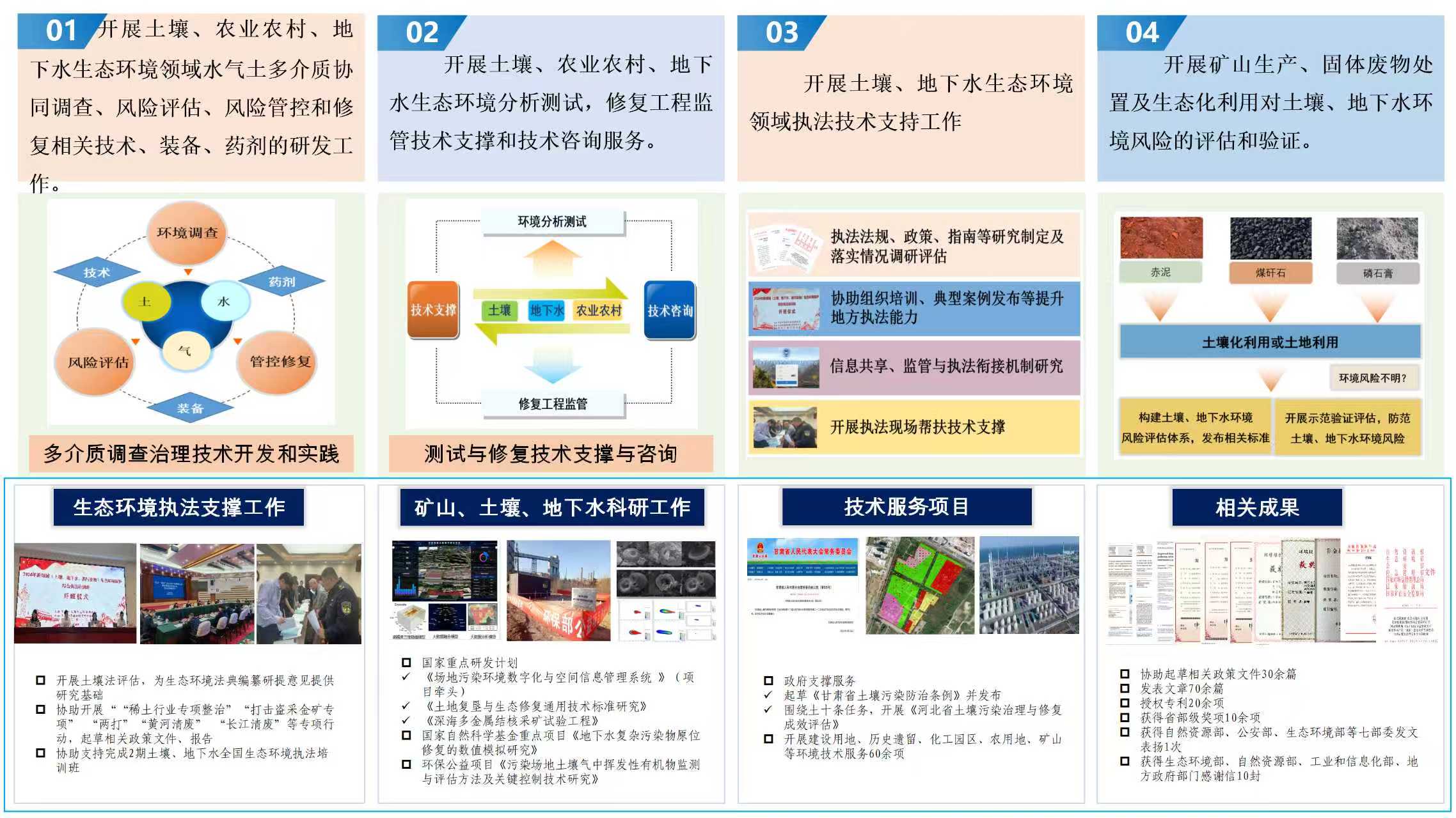 承担土壤、农业农村和地下水生态环境分析测试、修复工程监管技术支撑和技术咨询服务。承担相关技术、装备、药剂研发工作。
