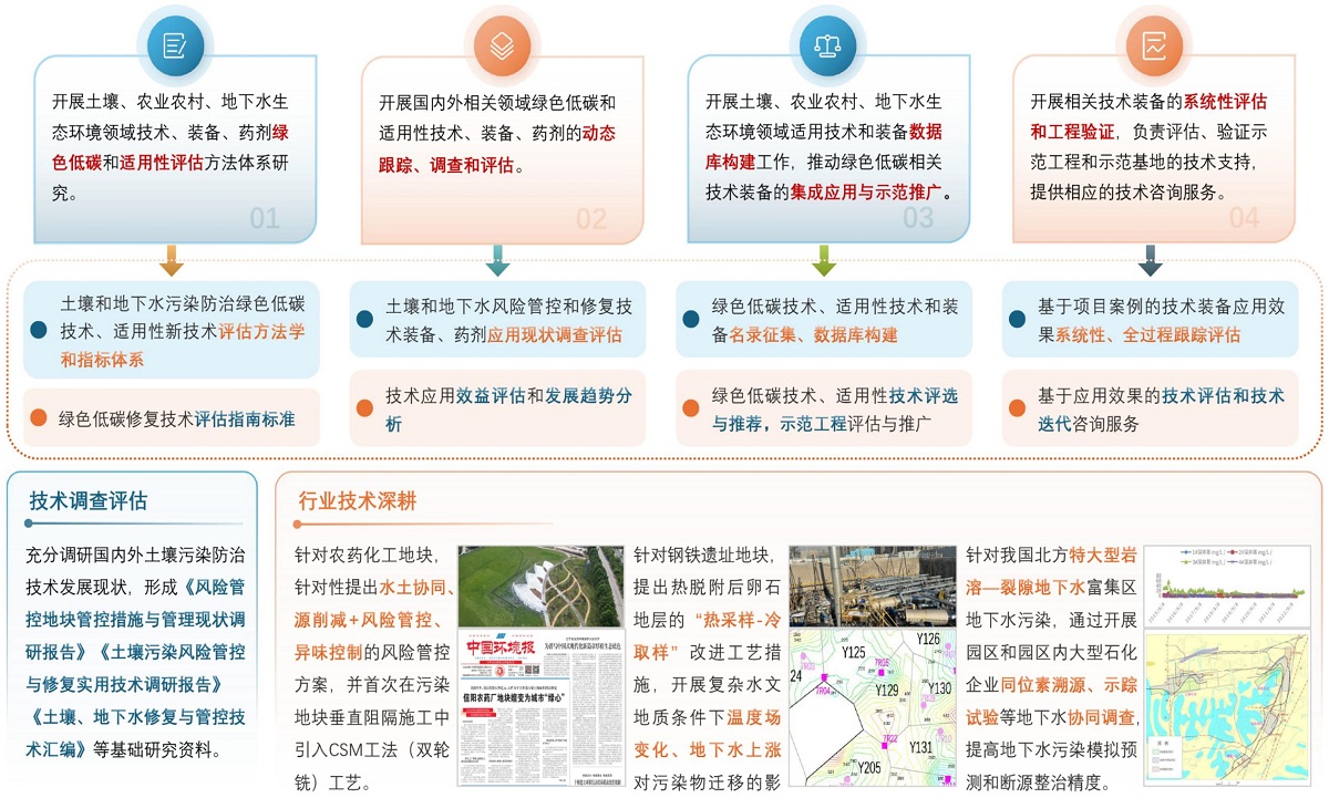 承担土壤、农业农村、地下水生态环境保护相关技术和装备的调查、评估,适用技术和装备数据库的构建等工作,推动绿色低碳技术装备的集成应用与示范推广。