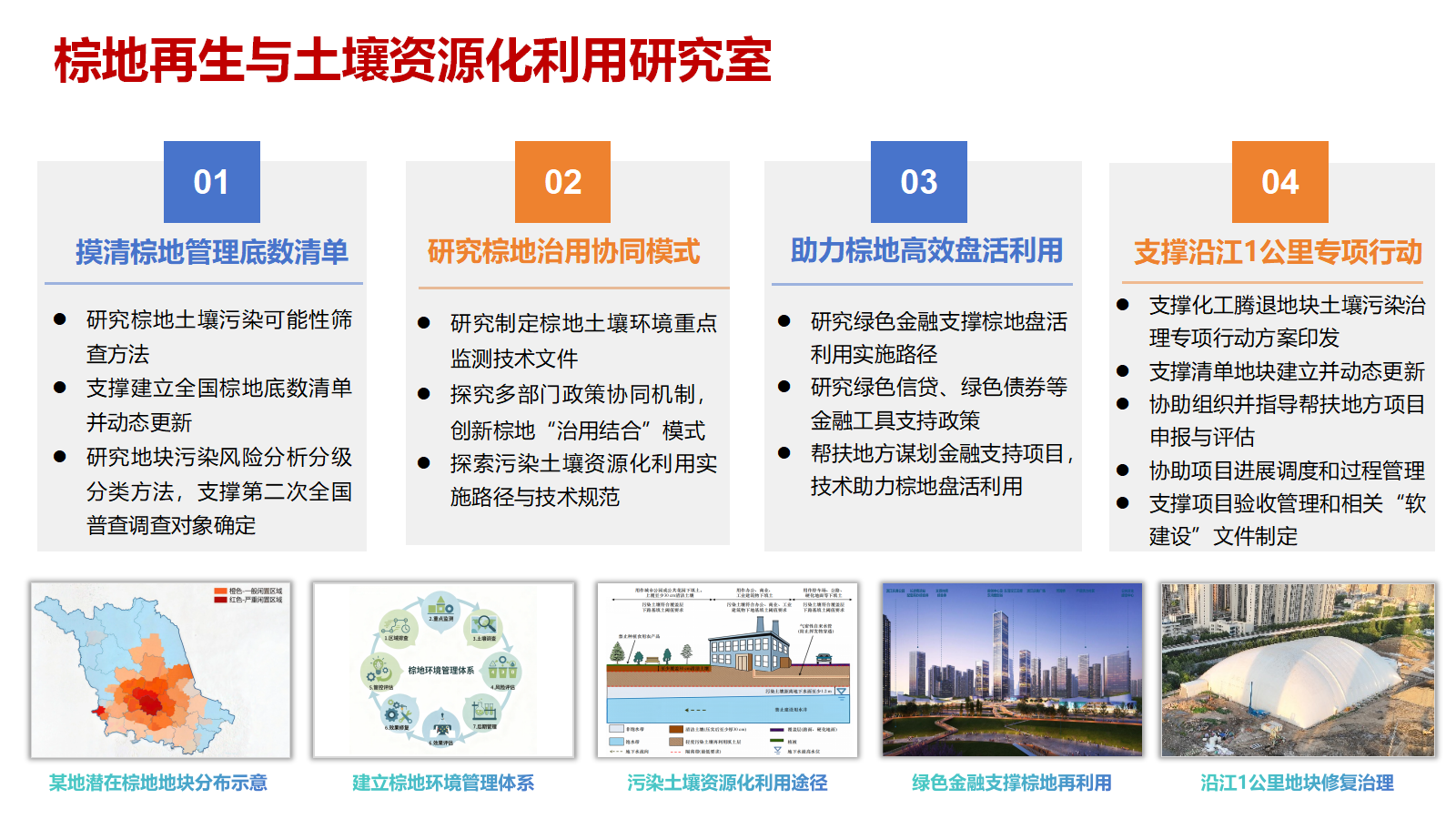 承担闲置地块再生利用土壤生态环境管理、污染土壤资源化利用政策和技术研究。开展相关修复技术和材料、成果转化等研究。