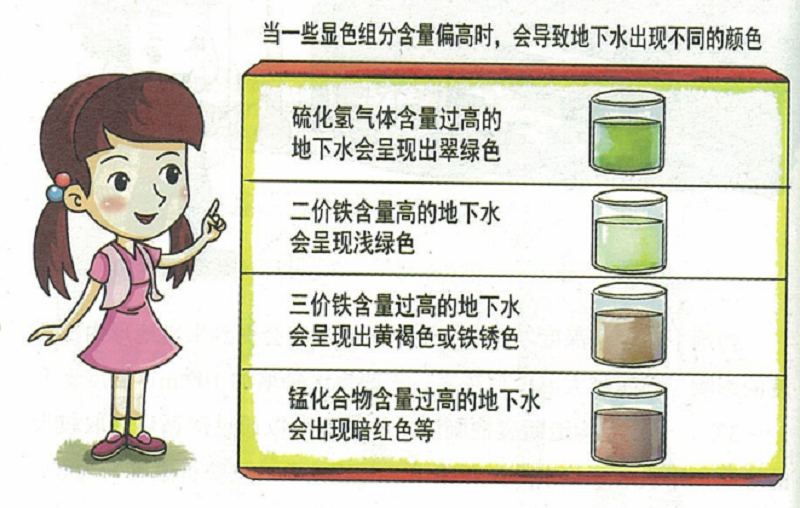 地下水颜色取决于它的化学成分和悬浮于其中的杂质。一般来说,地下水与纯水一样,是无色、无味、透明的。当一些显色组分含量偏高时,会导致地下水出现不同的颜色,如:硫化氢气体含量过高的地下水会呈现出翠绿色,二价铁含量高的地下水会呈现出浅绿色,三价铁含量过高的地下水会呈现出黄褐色或铁锈色,锰化合物含量过高的地下水会呈现出暗红色等等,受污染地下水有可能出现更为复杂的颜色。