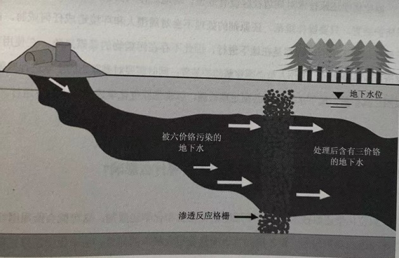 (2)可渗透反应格栅。在地下挖一道沟,将还原剂填充进去,形成一道可渗透的格栅。常用的填充物是大颗粒的还原铁粉。地下水流过格栅时,水中的污染物与还原剂发生化学反应。可渗透反应格栅是用来处理地下水中的污染物,而且只能处理流过格栅的地下水。
